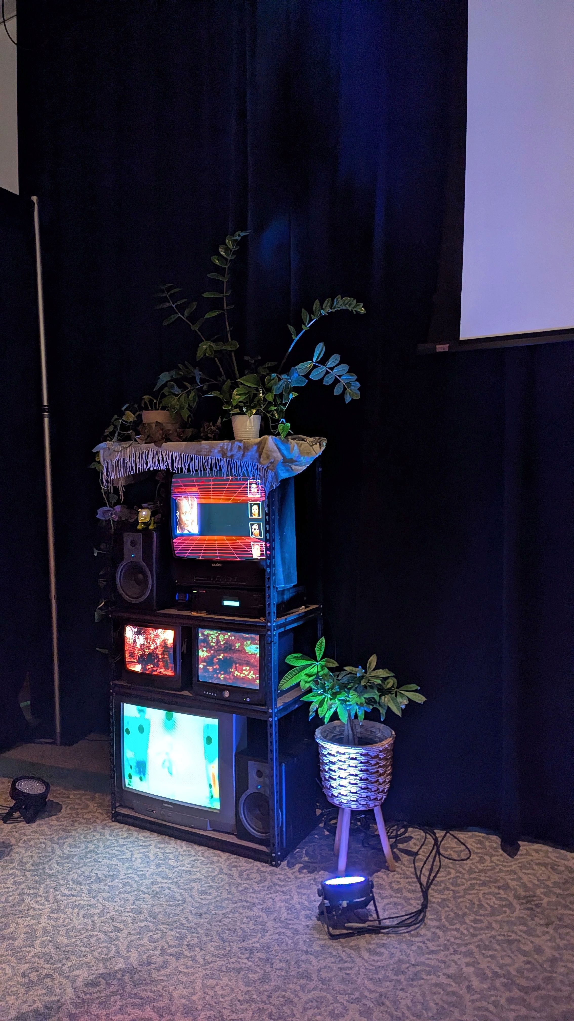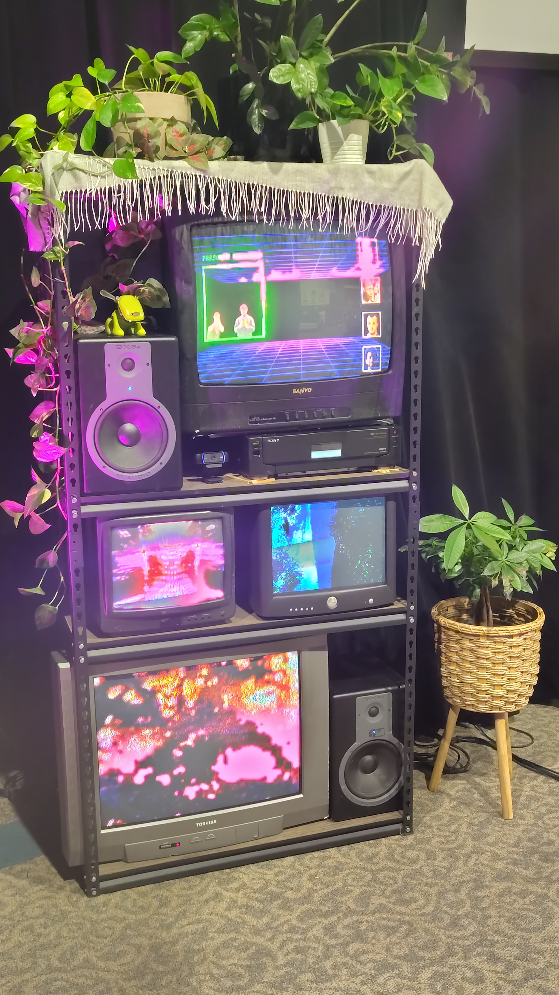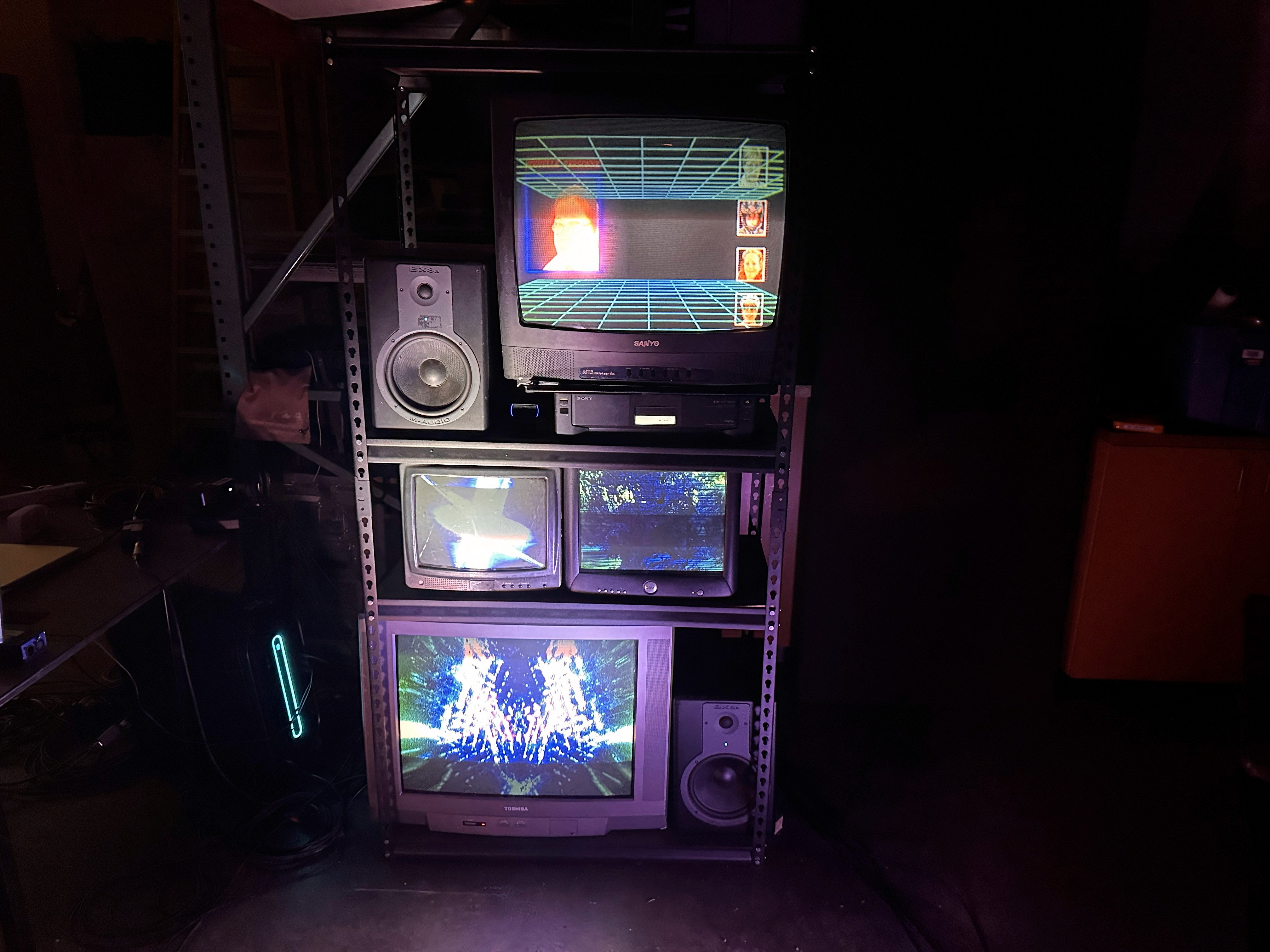 This second iteration shifts toward a more subtle and unavoidable form of interaction. The installation takes the form of an industrial-style steel shelf with wooden panels, holding four CRT televisions of varying sizes. The scenography intentionally resembles an ordinary piece of furniture you might find in someone’s home, complete with speakers, plants, a grandmother-style blanket, and an iDog connected via audio jack that emits spontaneous sounds.