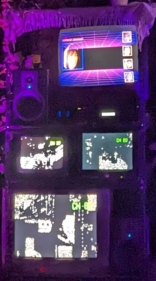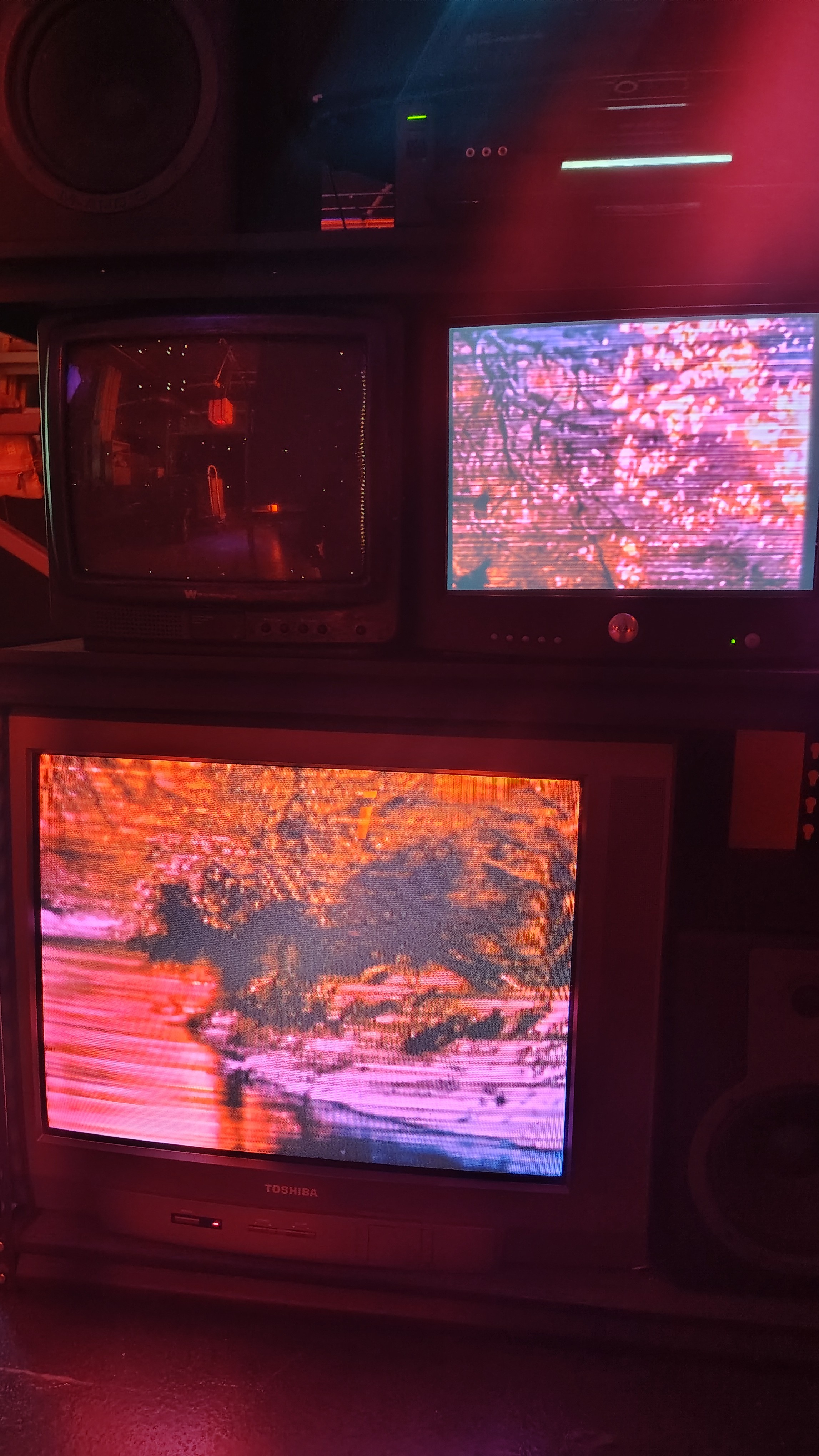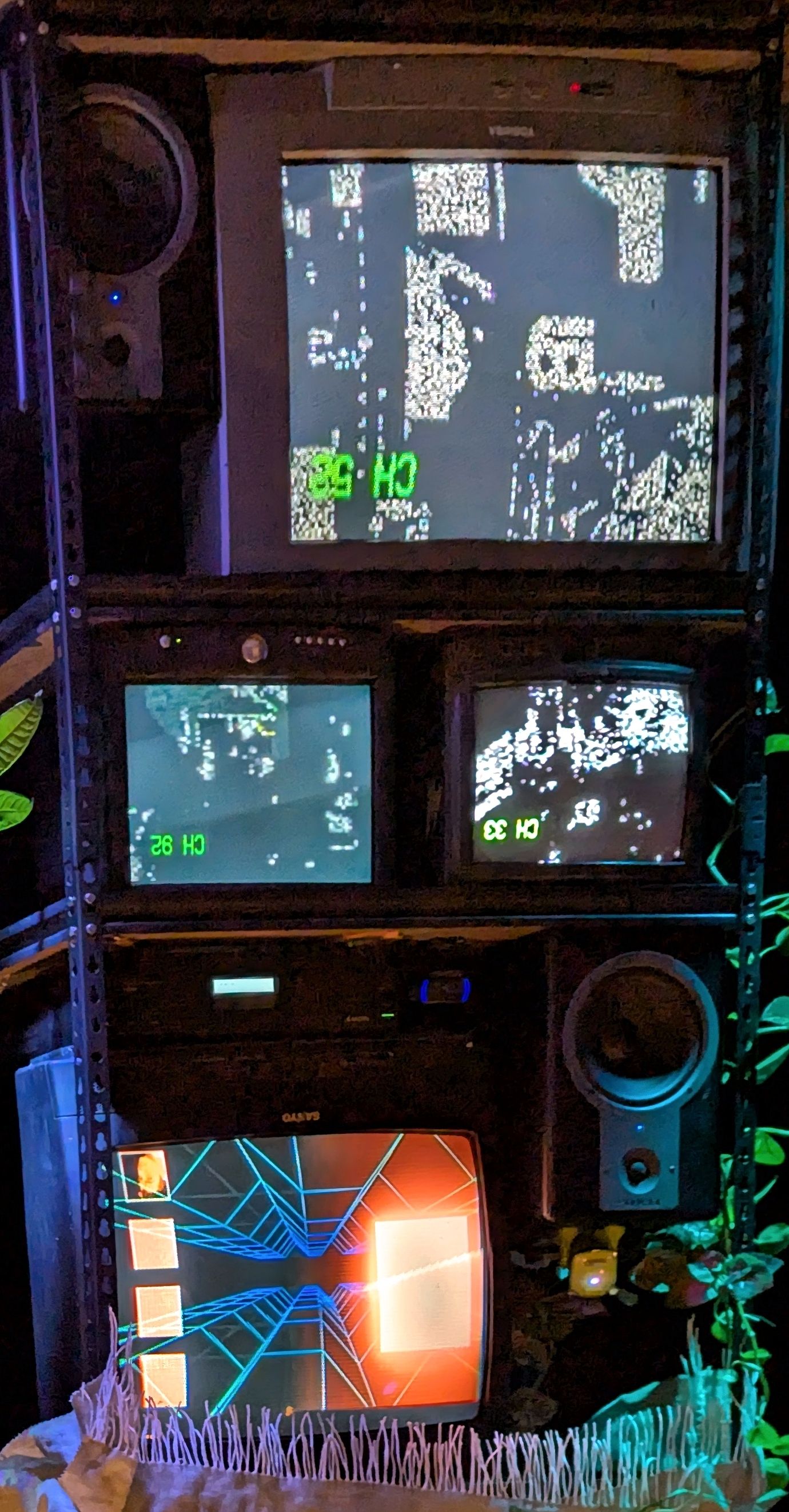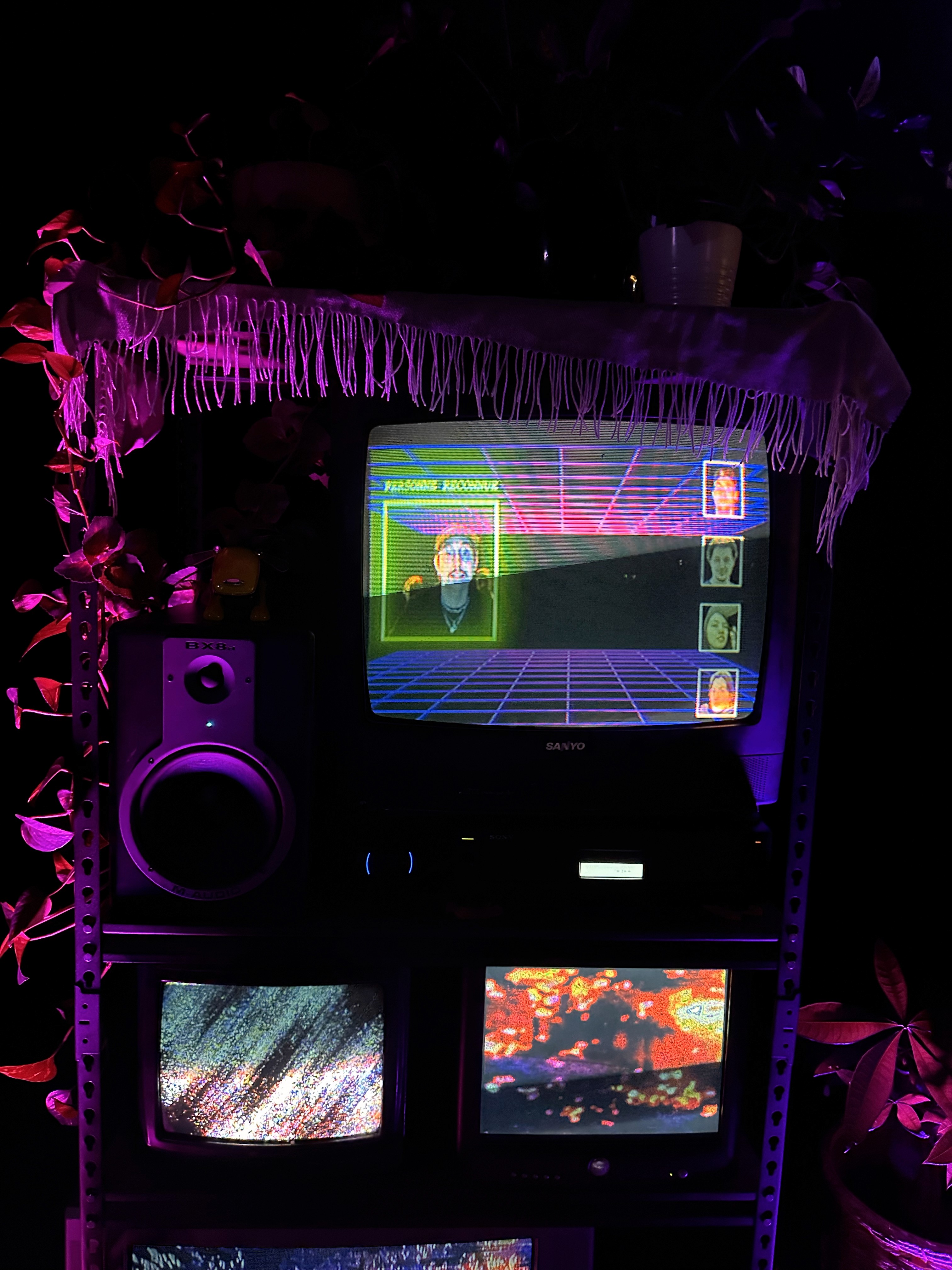 This second iteration shifts toward a more subtle and unavoidable form of interaction. The installation takes the form of an industrial-style steel shelf with wooden panels, holding four CRT televisions of varying sizes. The scenography intentionally resembles an ordinary piece of furniture you might find in someone’s home, complete with speakers, plants, a grandmother-style blanket, and an iDog connected via audio jack that emits spontaneous sounds.